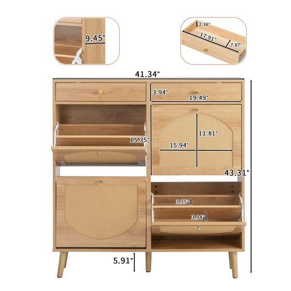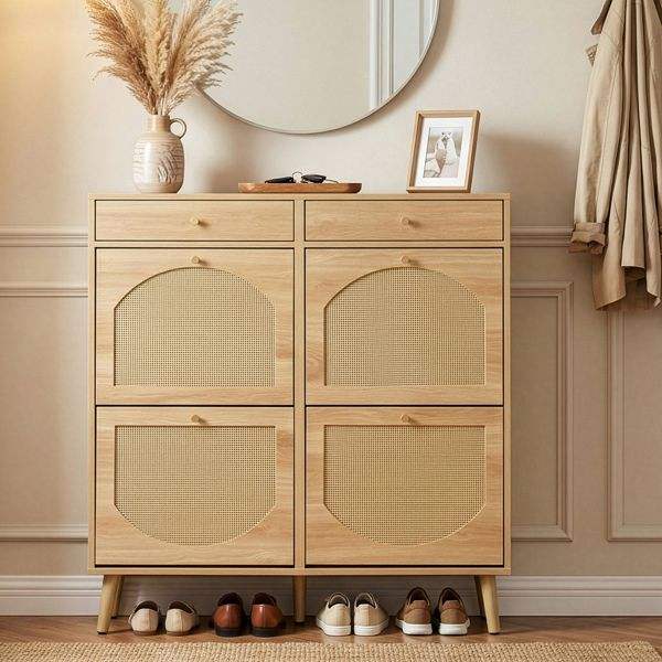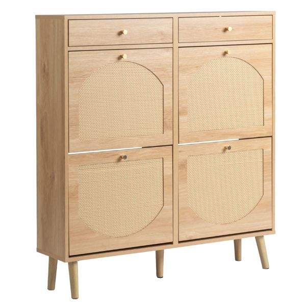 Meuble à chaussures en rotin couleur bois naturel avec 2 tiroirs et 4 compartiments rabattables 105*24*110cm en panneaux de particules