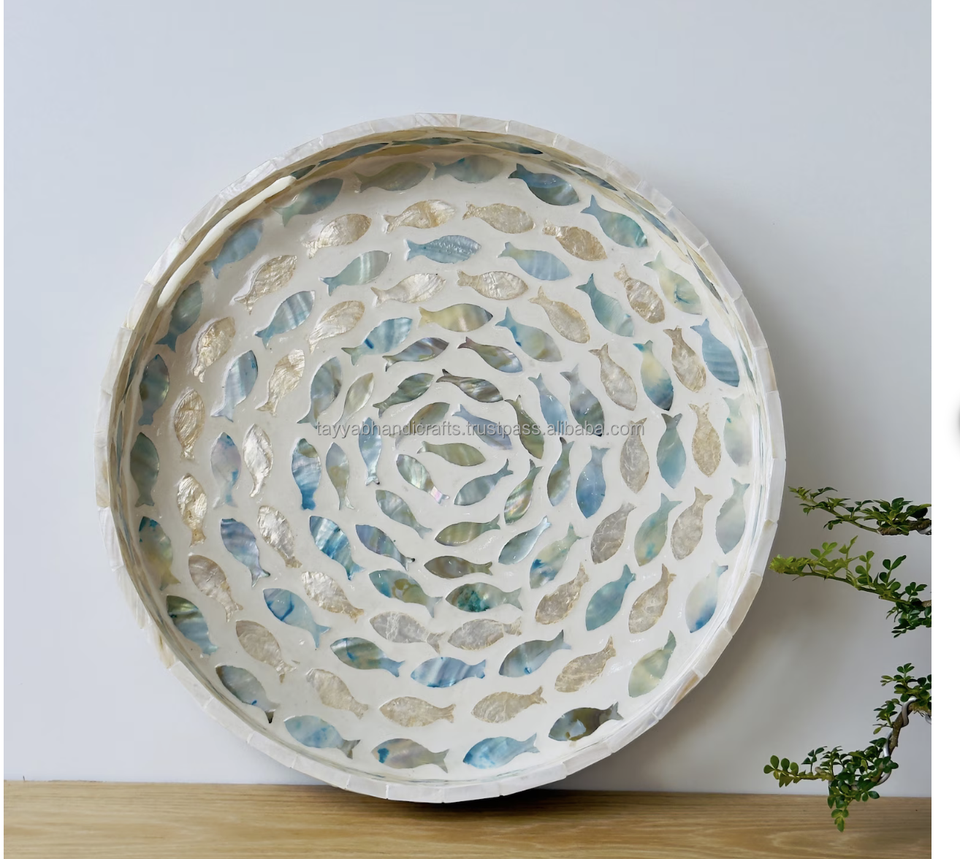 Plateau de service en bois naturel avec incrustations de nacre et d'os, fait à la main pour la maison, les restaurants, les hôtels, inspiré de l'Inde