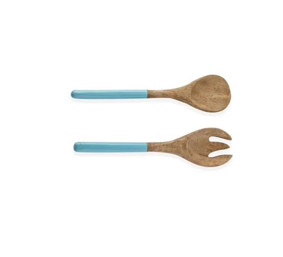 Cuillère à salade en résine de bois naturel de couleur bleue ensemble de serveurs à salade cuillère à salade en bois fourchette à salade pour forme ronde à vendre