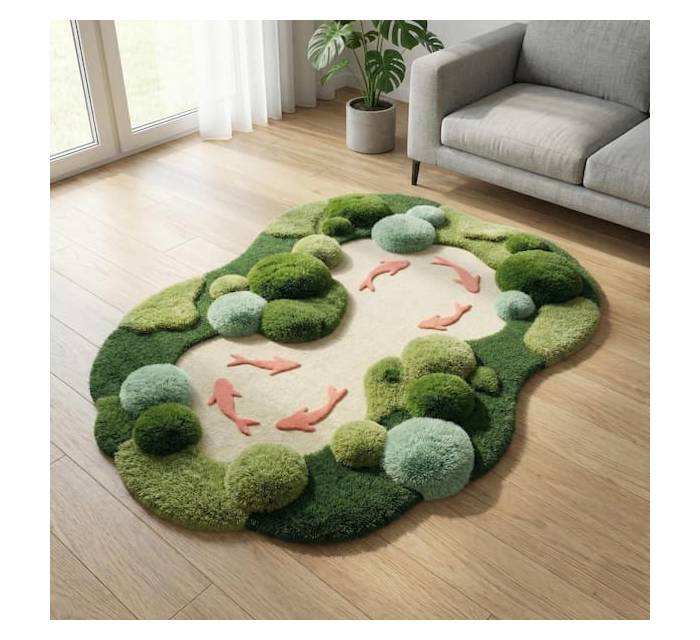 Tapis en mousse sculptée 3D inspiré de la nature, tapis de bassin à poissons en pure laine tufté à la main par un designer, tapis d'art créatif à formes organiques abstraites