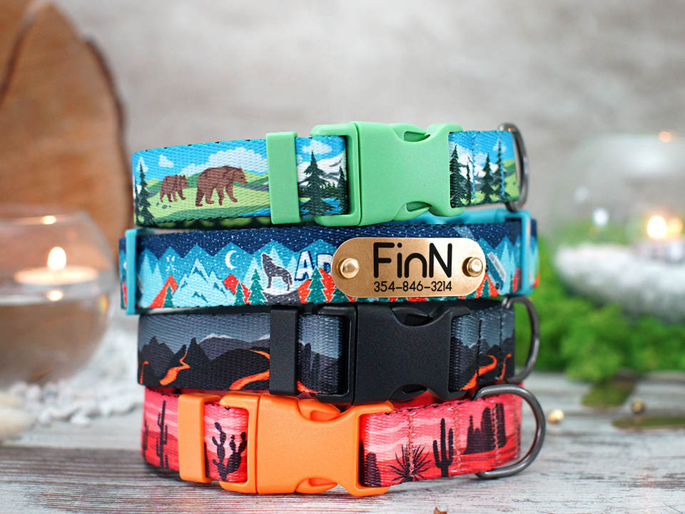 Nature avec étiquette d'identification de nom, collier d'impression de montagnes, forêt d'arbres, collier d'animal familier pour de petites races moyennes et grandes de chien