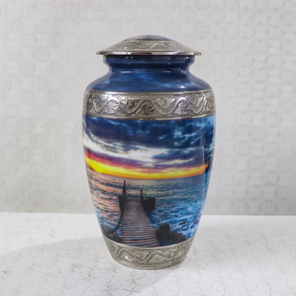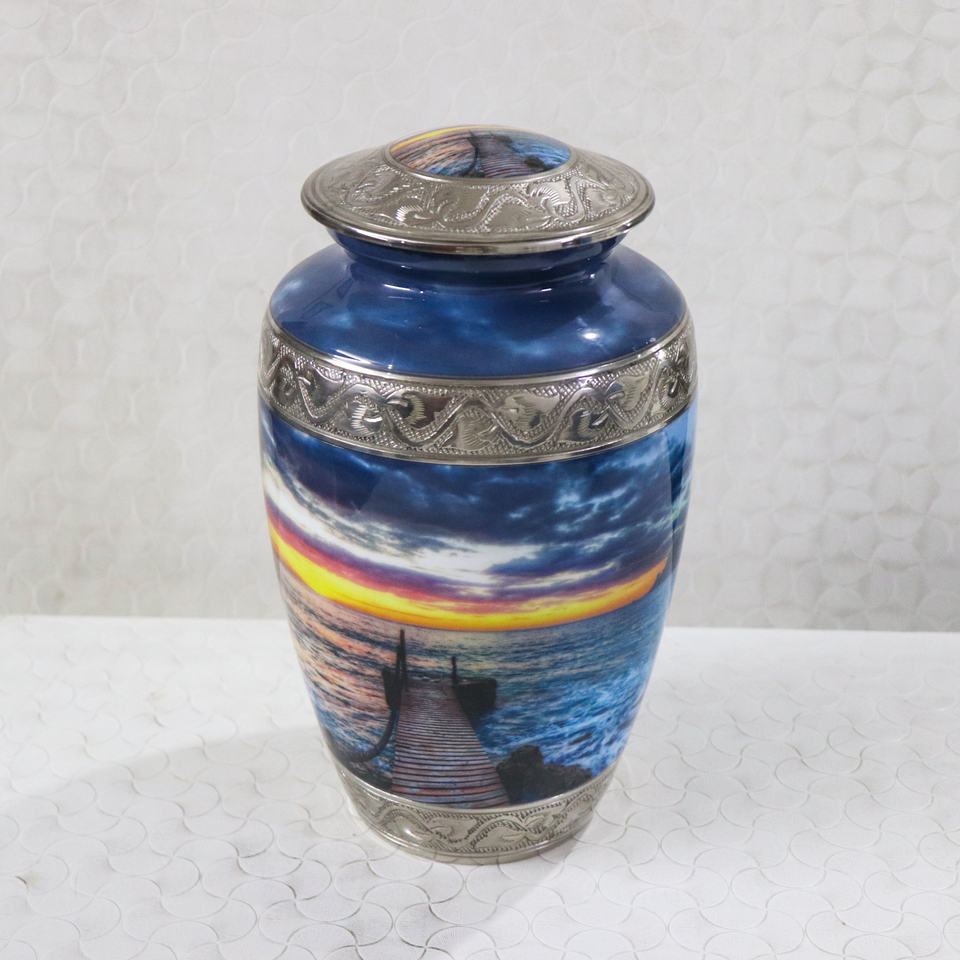 Urne funéraire classique en aluminium gravée avec vue sur la nature, fournitures funéraires, urne funéraire pour cendres humaines, urne adulte de 10 pouces