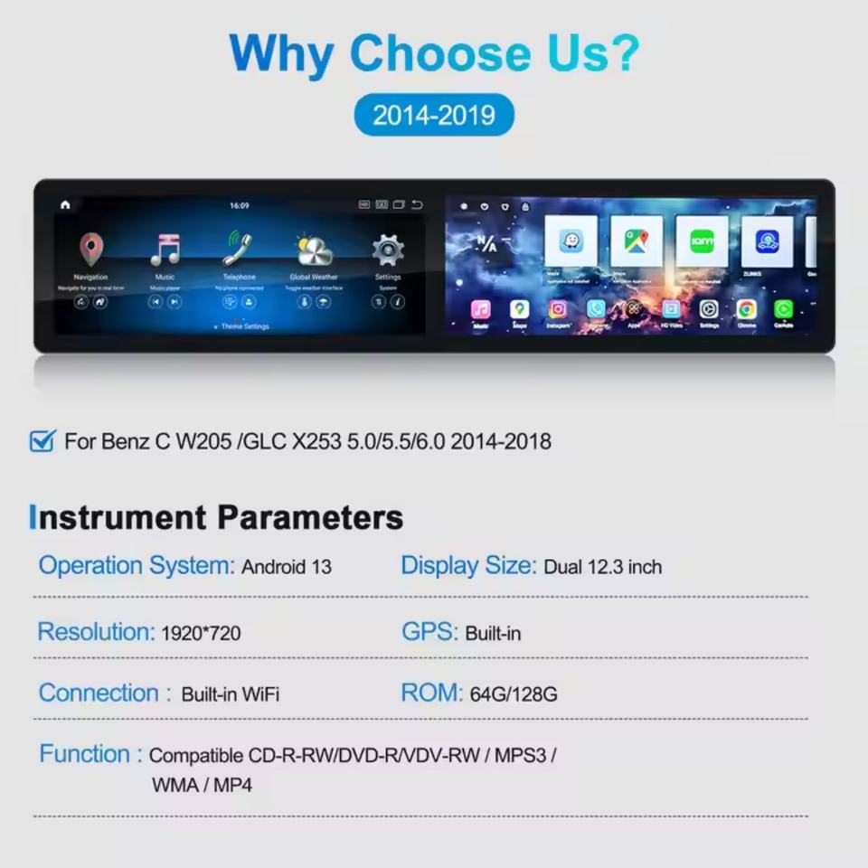 Autoradio Navihua Android 12,3 pouces à double écran, navigation, divertissement pour passagers, CarPlay pour Mercedes C W205 GLC