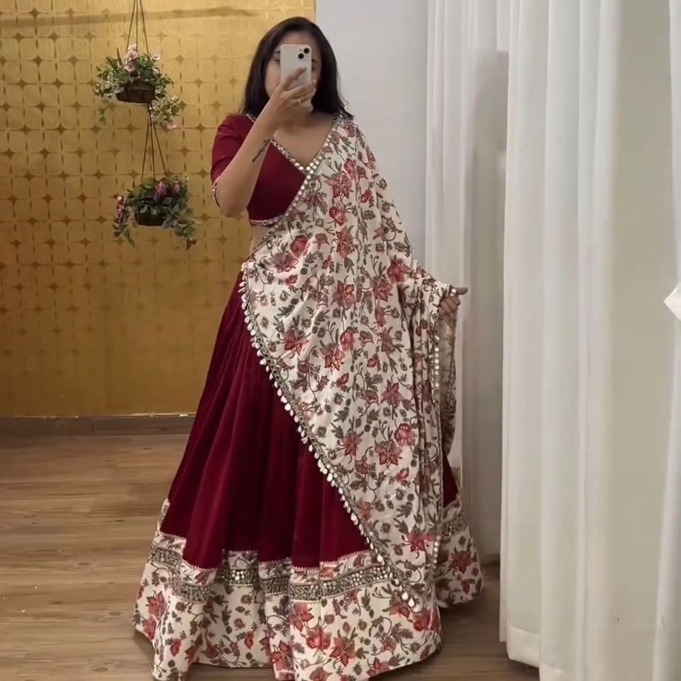 Nom du produit:Séquence De Coton Et Impression Lehenga Et Malay Satin De Soie Choli Dupatta