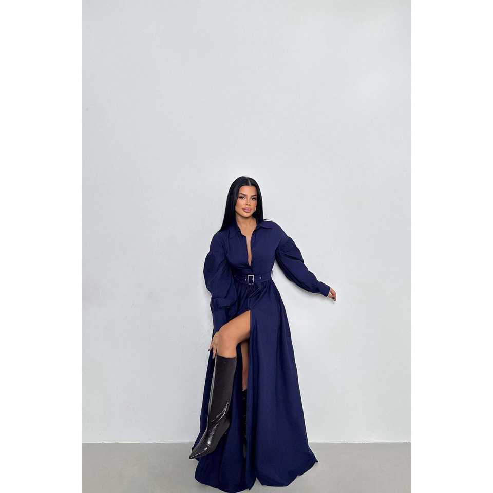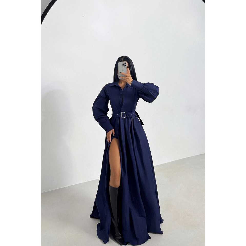 Navy Blue Ball Gown Evening Dress with Belt Detail XS/XL Formal Prom Dresses Short Sleeves Knee-Length