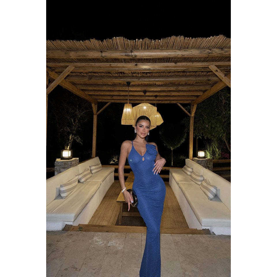 Robe de soirée bleu marine coupe trapèze avec détails roses, manches courtes, décorations de sequins et strass, style chic empire, longueur ras du sol, ornée de plumes