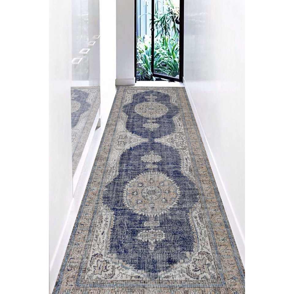 Tapis turc bleu marine : motif ethnique délavé, tapis antidérapant, tapis fin non tissé