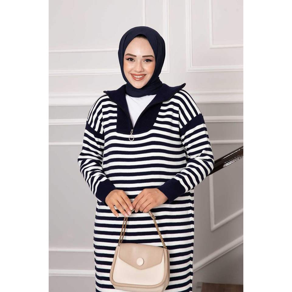 Robe en tricot rayé à fermeture éclair bleu marine décontractée A-ligne midi et longueur genou avec style asymétrique pour l'été