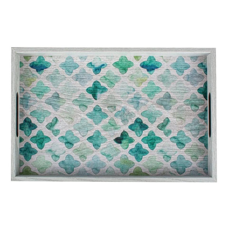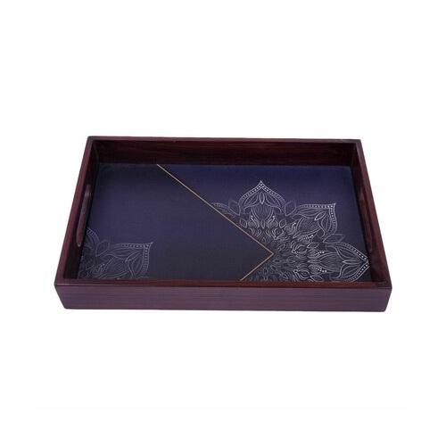 Plateau décoratif imprimé mandala bleu marine et motifs géométriques dorés, plateau de service en bois finition antique pour commande en gros