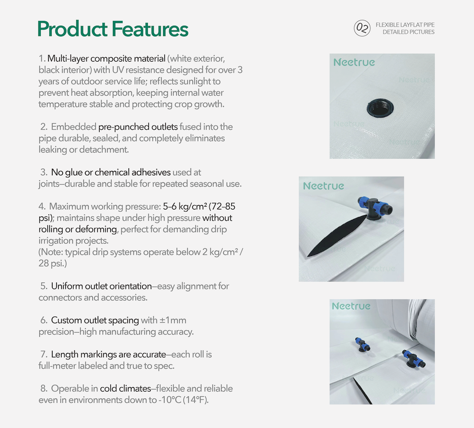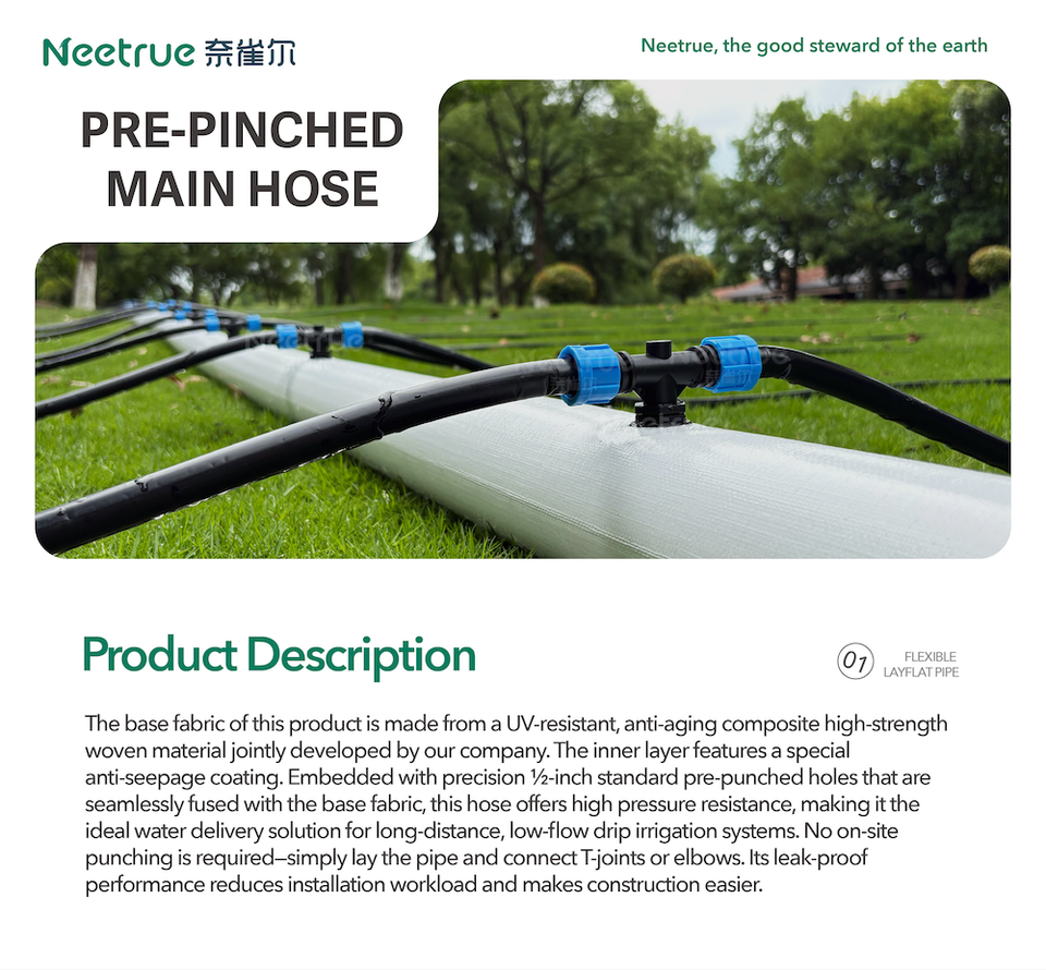 Tuyau d'irrigation goutte à goutte plat en PE pré-perforé Neetrue NTS-RXG 6x4 pouces, 1000m/rouleau, longueur et épaisseur personnalisables