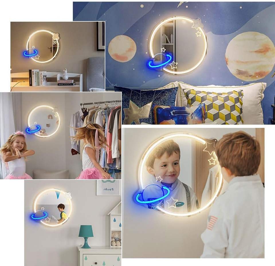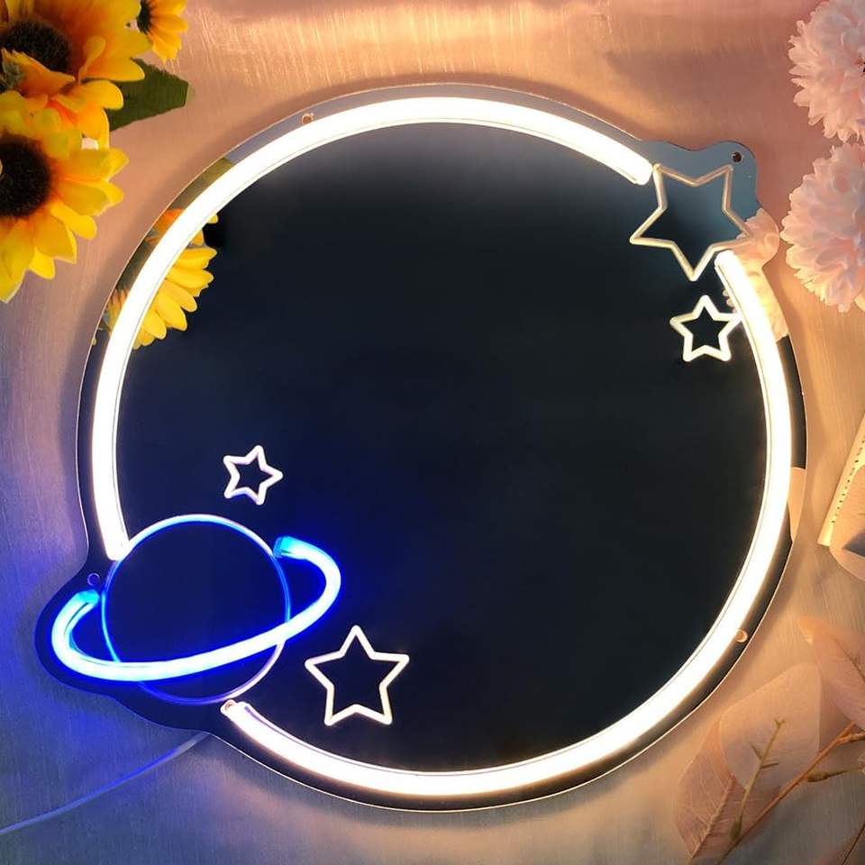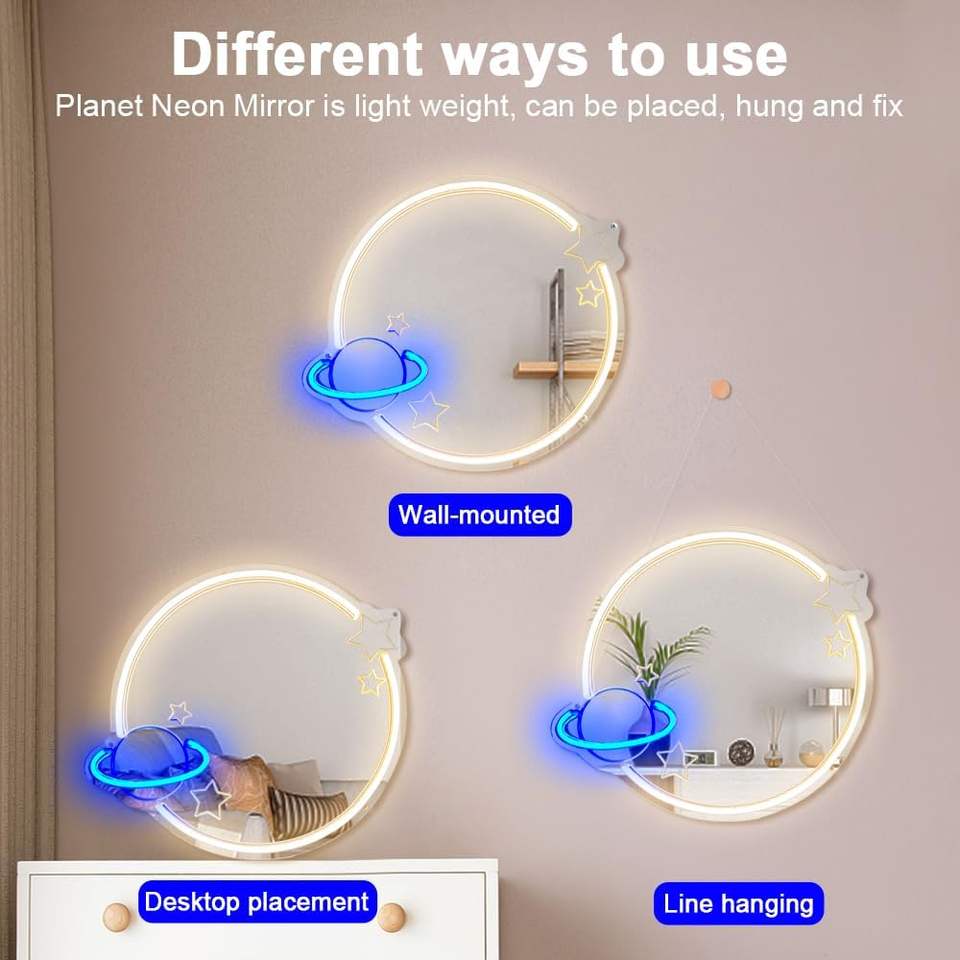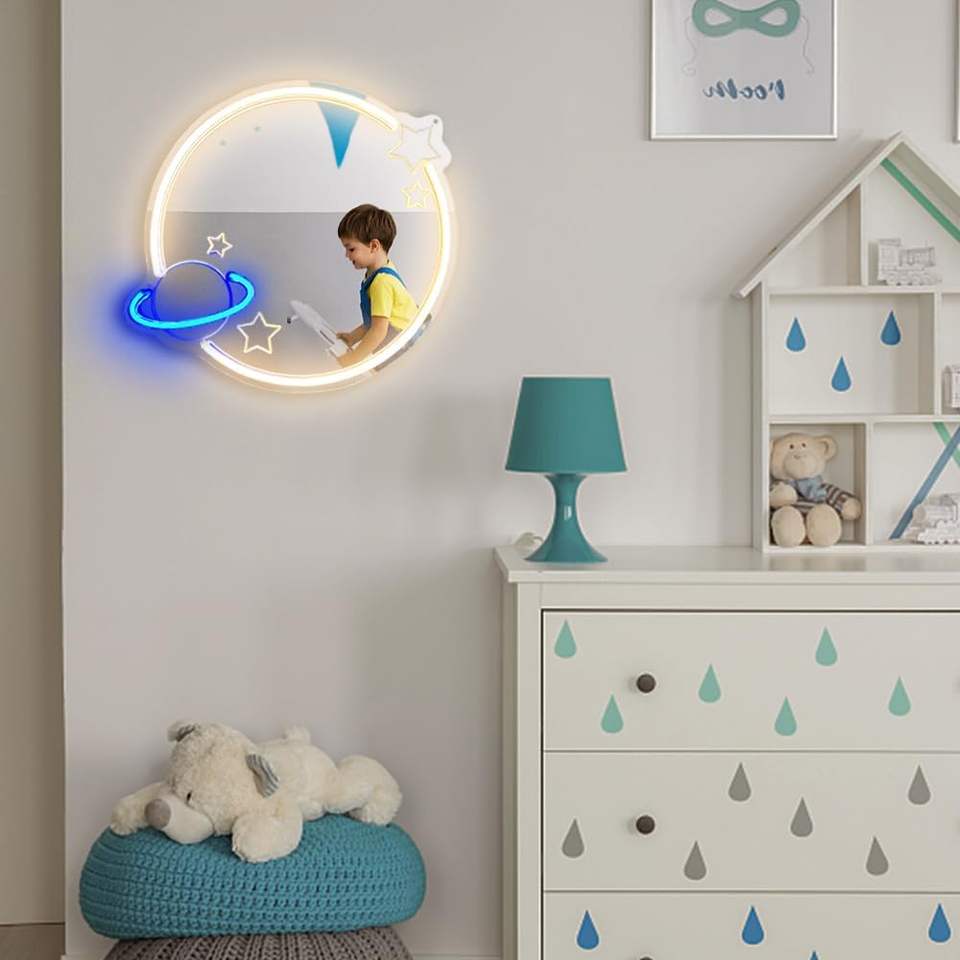 Lampe miroir planète néon pour enfants et salon Décoration murale sur le thème de l'espace Vestiaire de chambre à coucher de mariage Miroir en acrylique Éclairage mural