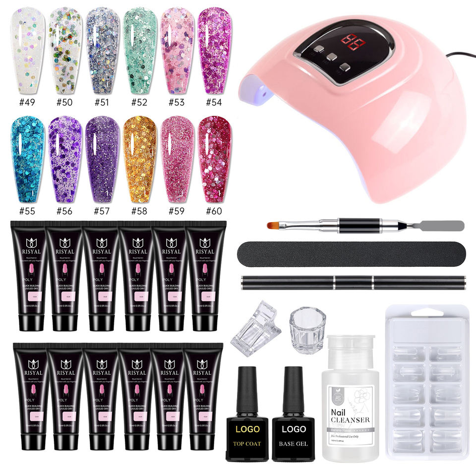 Kit Acrylgel Poly Néon pour Ongles 15 ML, Vernis Gel Acrylique d'Extension Nude, 12 Couleurs avec Solution de Glissement, Kit de Démarrage avec Lampe UV