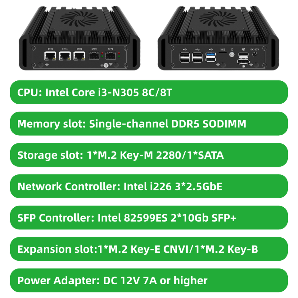 Périphérique réseau avec ventilateur intelligent pour Firewall Home Server NAS Inside Core I3-N305 2x10G SFP + et 3x2.5GbE H31F-N305-3L2S