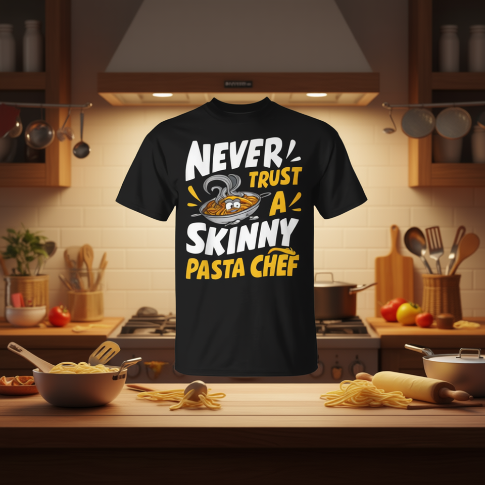 T-shirt Never Trust A Skinny Pasta Chef, design Pasta Party, chemise noire pour hommes