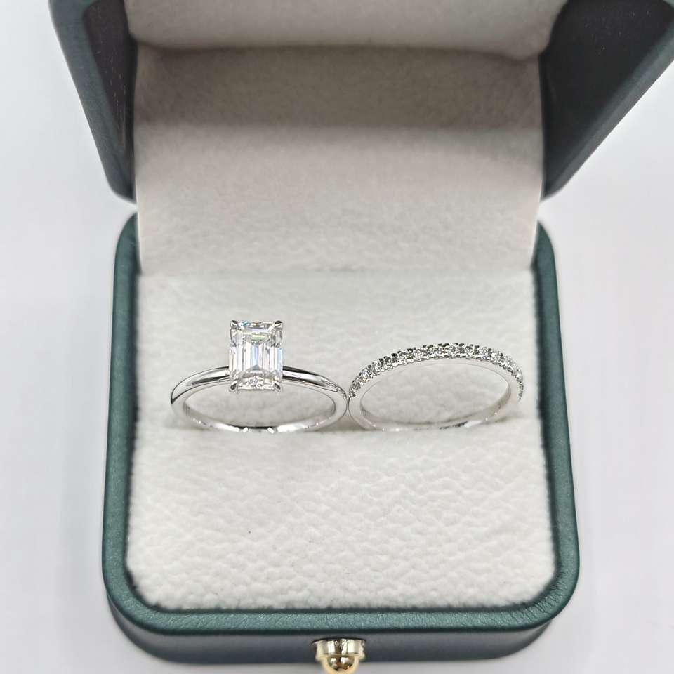 Nouvelle bague de fiançailles classique en moissanite taille émeraude 1 CT, pavé demi-éternité, alliance, ensemble de mariage pour femme, argent 925