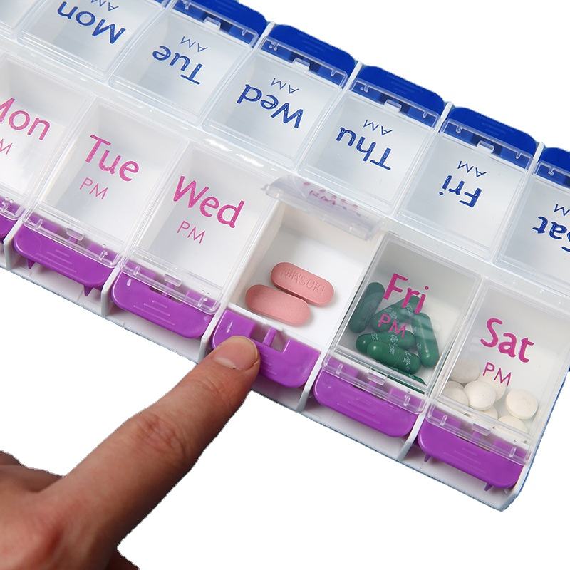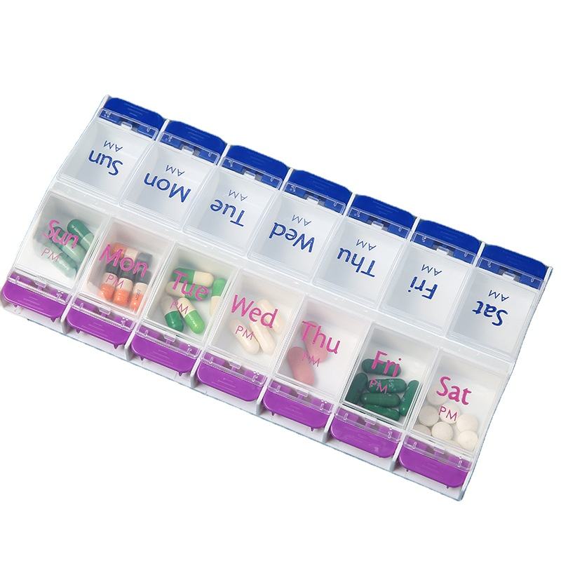 Nouvelle boîte à pilules portable en plastique à 14 compartiments, à ressort indépendant, double rangée, pour une semaine