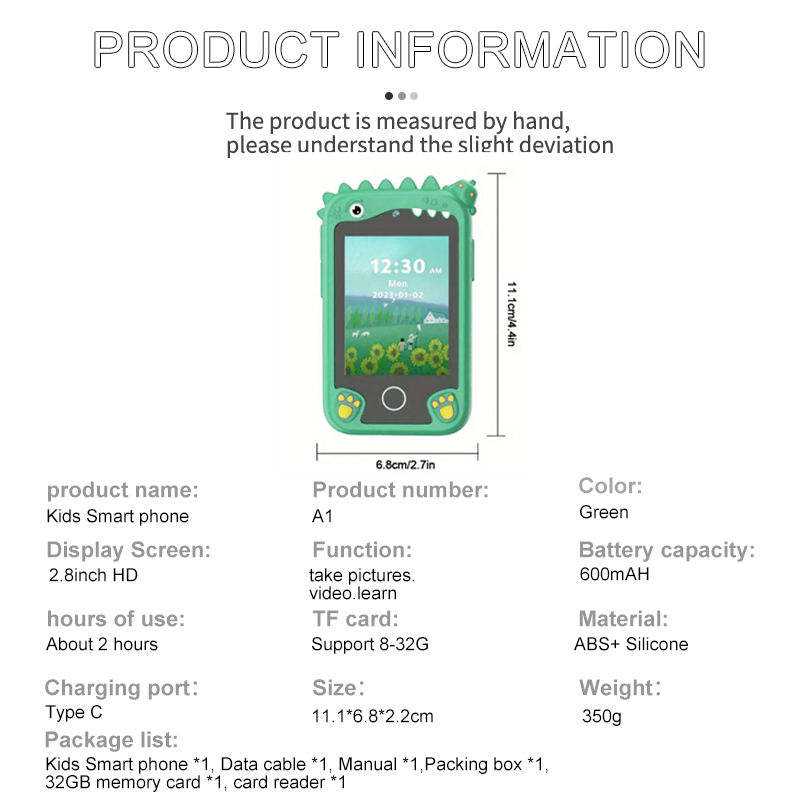Nouveau Téléphone Intelligent Jouet pour Enfants Style Dinosaure 2,8 Pouces, Capteur d'Image CMOS, Grand Angle 180°, Prend en Charge 8-32 Go, Cadeau de Noël Éducatif