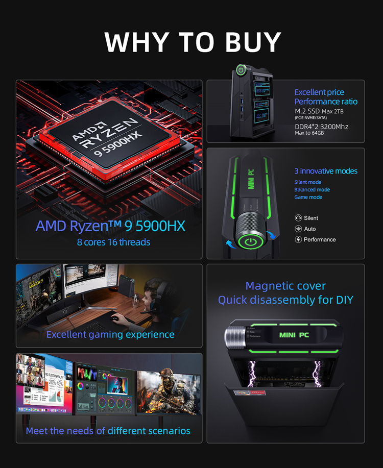 Nouvel ordinateur AM08, AMD R-yzen 9 5900HX, PC 8 cœurs 16 threads, M.2 NVME 2 To, WIFI 6, 4 USB, 1 Type-C, mini PC de jeu à triple écran