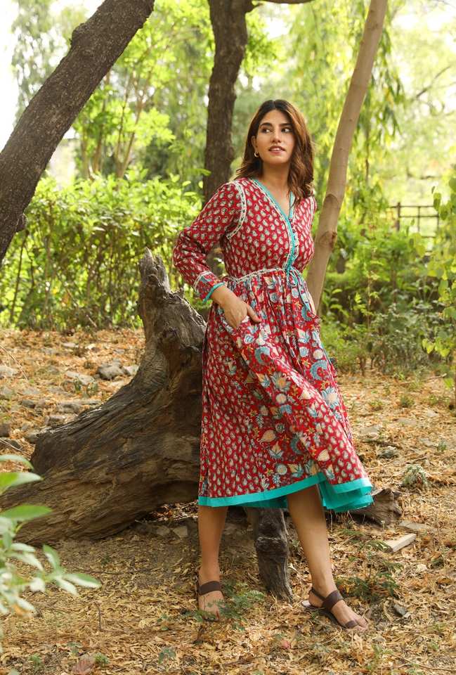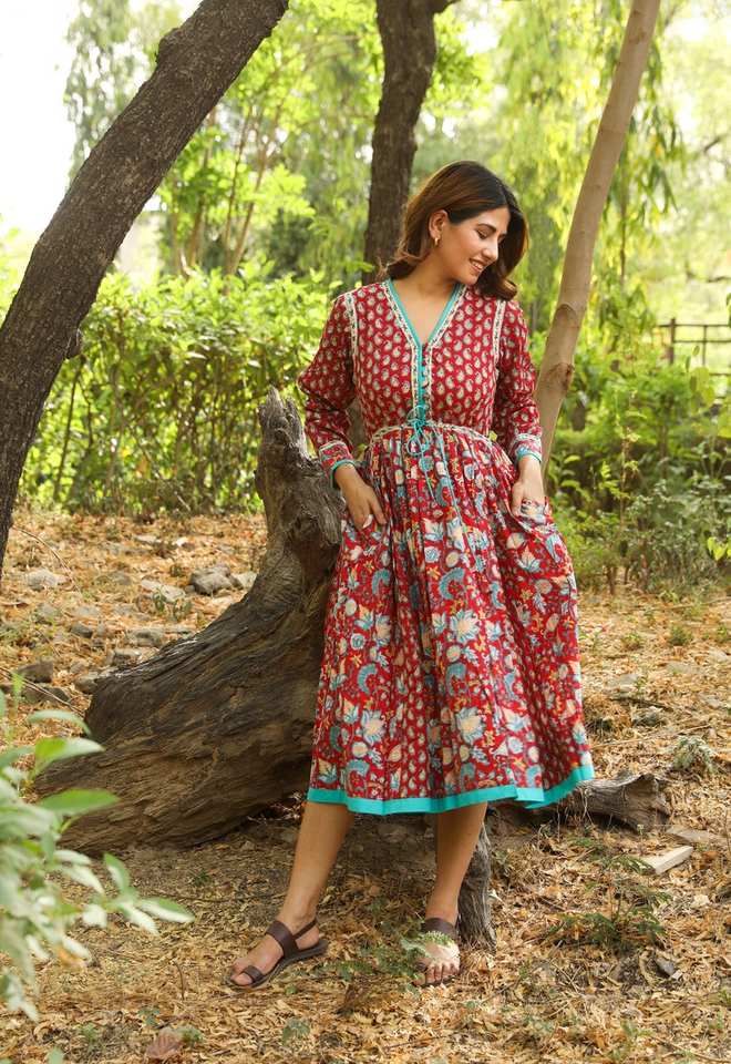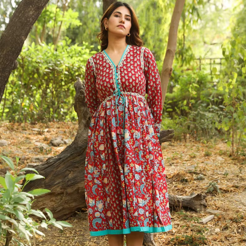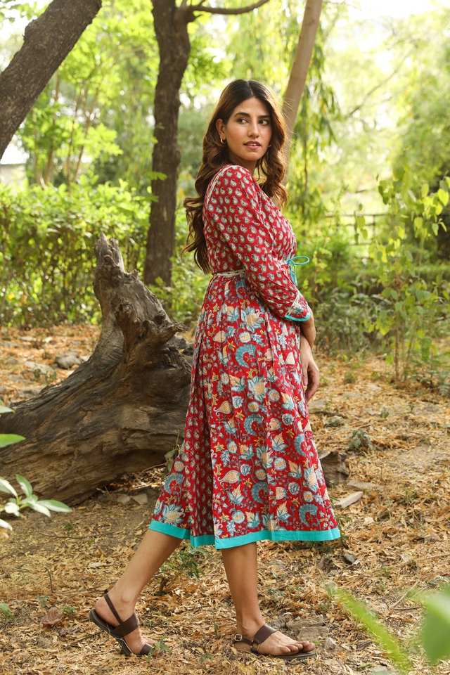 New Amanda Bohemian Midi Dress Hand Block Printed Pure Cotton Red Blue Floral Ethical Handmade Casual Occasion Wear