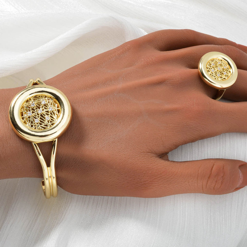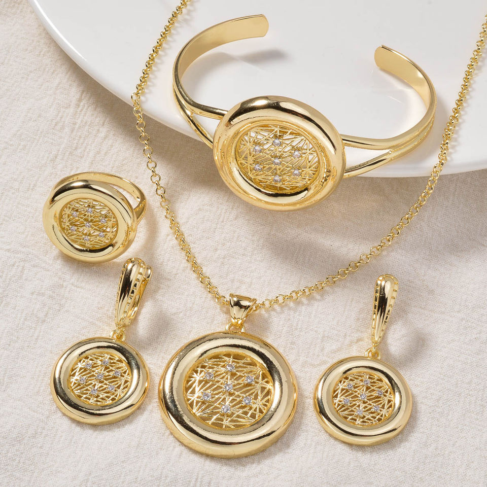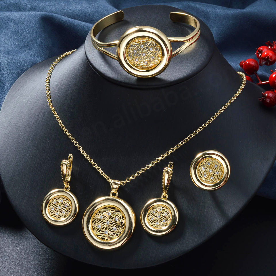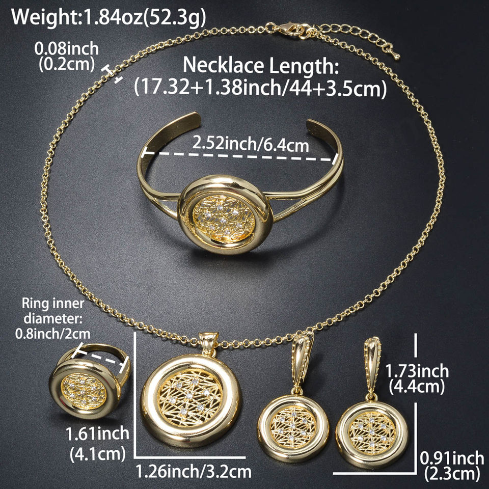 Nouveauté Collier, boucles d'oreilles, bague et bracelet en laiton plaqué or 14 carats avec zircon, ensembles de bijoux de mariée pour femmes, fête