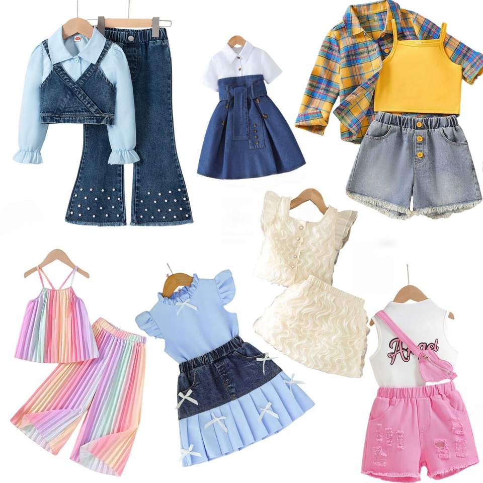 Nouveauté Ensemble de vêtements pour filles de 4 à 7 ans Veste en jean et pantalon Robe à blocs de couleur Vêtements décontractés pour tout-petits d'été