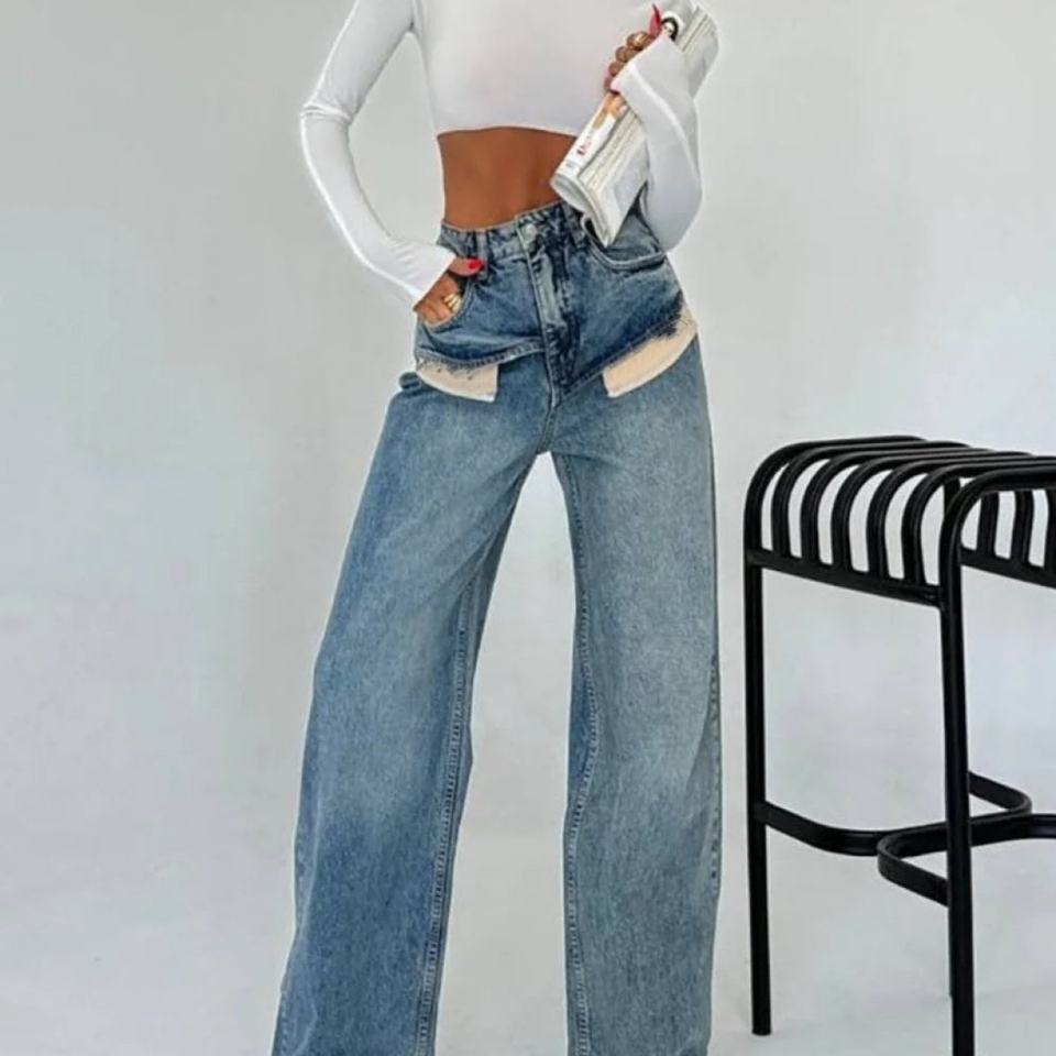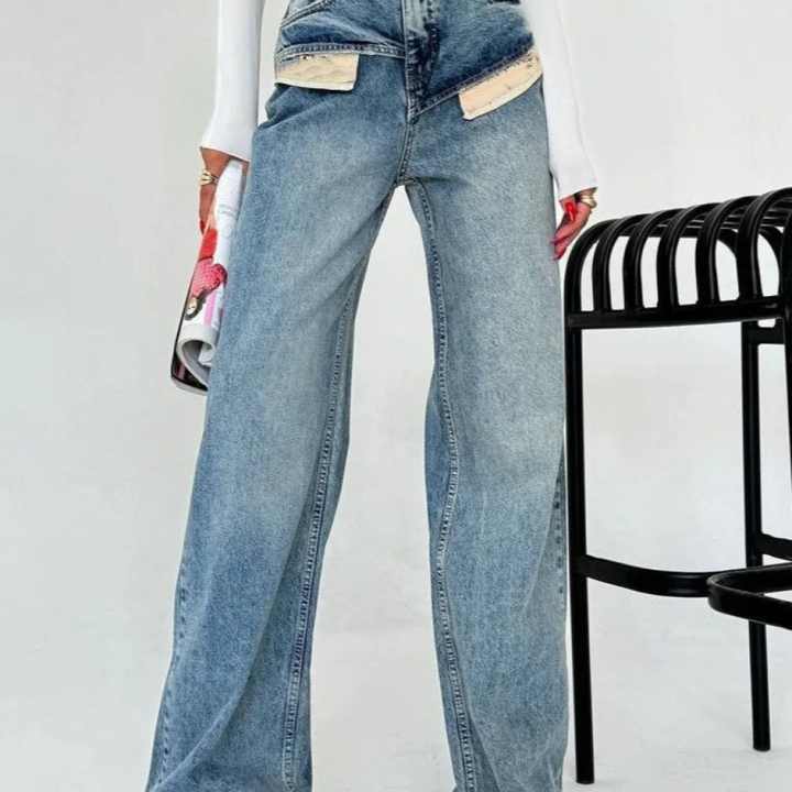 Nouvelle Arrivée Jean Femme Taille Haute Tendance avec Empiècements, Coupe Droite Ample, Design Classique Amincissant
