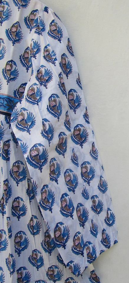 New Arrival Cotton Blue Floral Pattern Printed Women Mini Maxi Dress V-neckline With Tassel Mini Maxi Dress for Women
