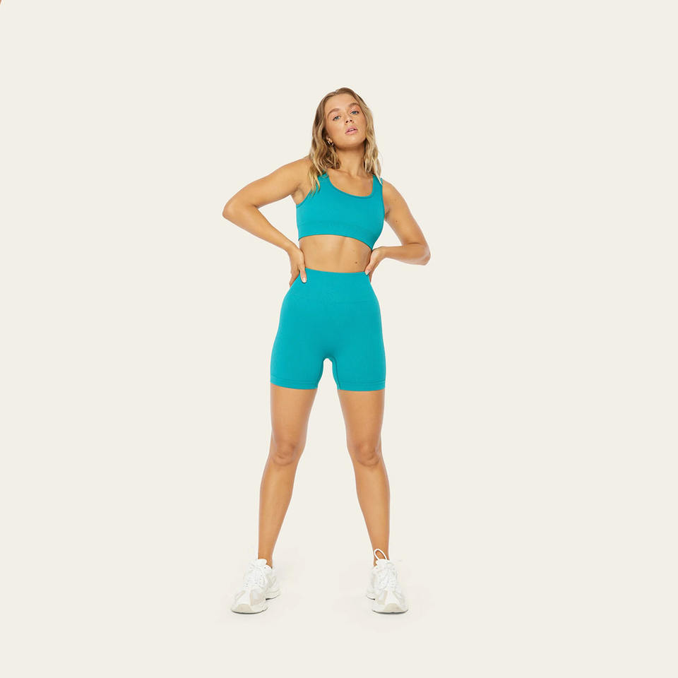 Nouvel arrivage d'ensembles de soutien-gorge de sport avec logo personnalisé short de yoga skinny fit scrunch et débardeur pour femmes tissu à tricoter uni
