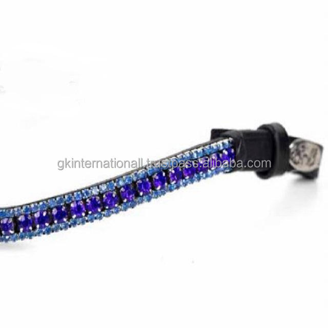 Nouvel arrivage Bande de front de cheval en cuir anglais noir en forme de vague sur mesure avec 3 rangées de cristaux de saphir Bande de front Mega Bling Wave