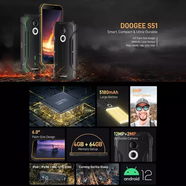 Doogee – Smartphone S51, android 12, NFC, 5180mAh, 4 + 64 go, Double caméra AI, Helio G25 Octa Core, bon marché, nouvel arrivage
