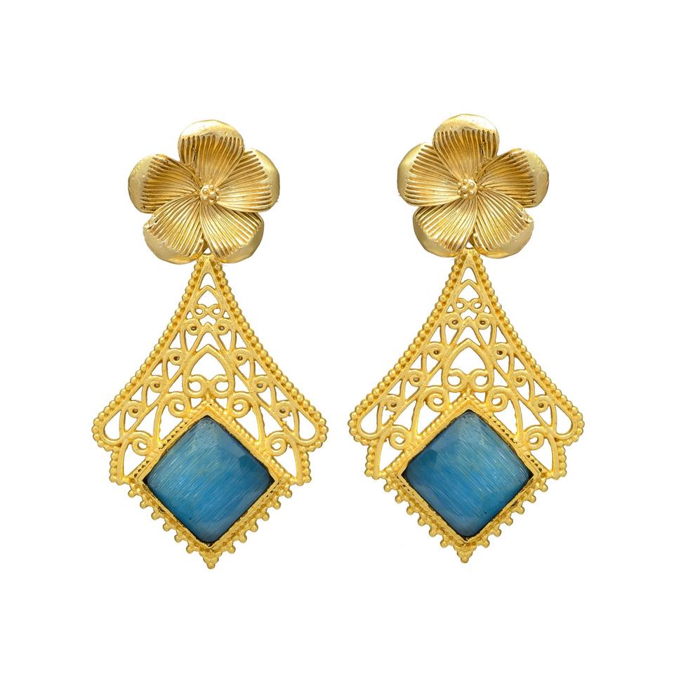 New Arrival Gold Tone Flower Design Drop Earrings with Dark Blue Quartz Gemstone Brass Earrings