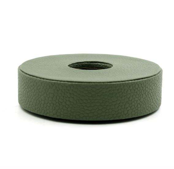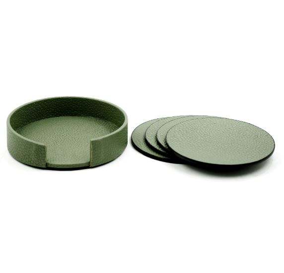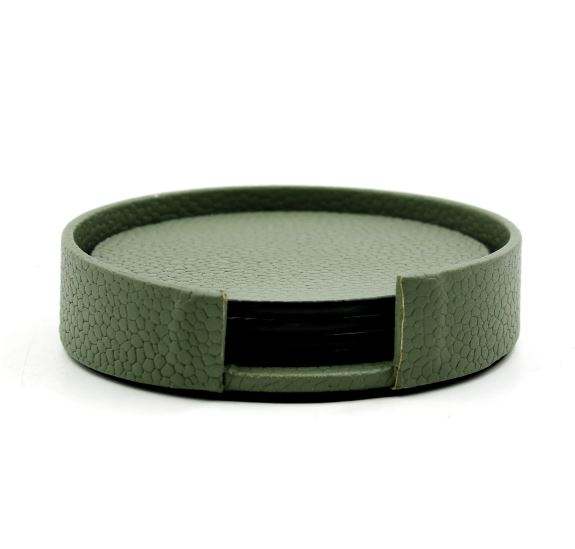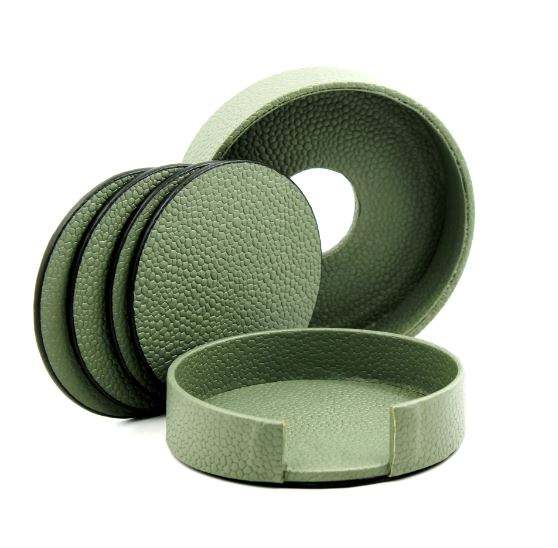 Dessous de verre en cuir vert avec couvercle de support Ensemble de 5 accessoires de décoration de table de forme ronde Dessous de verre en cuir à vendre