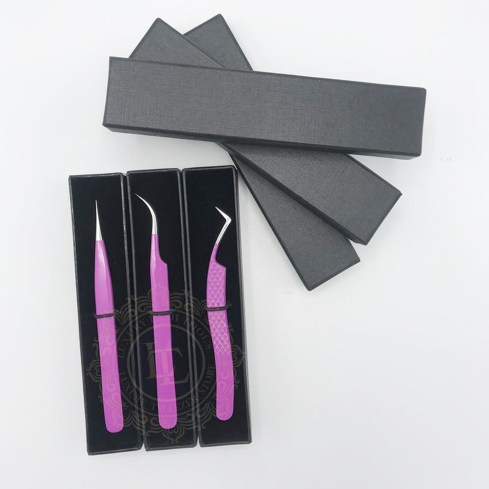 Nouvelle arrivée de pinces à cils durables testées à la main, revêtement en poudre violette, pointe argentée, marque privée avec emballage en boîte