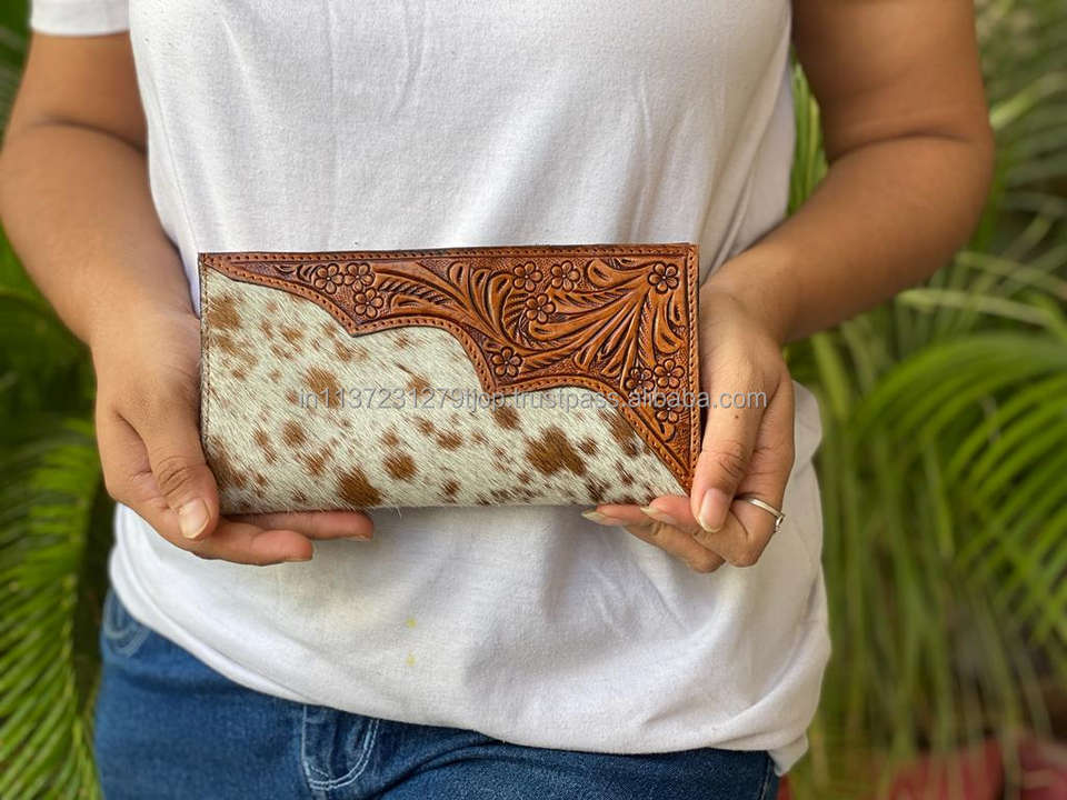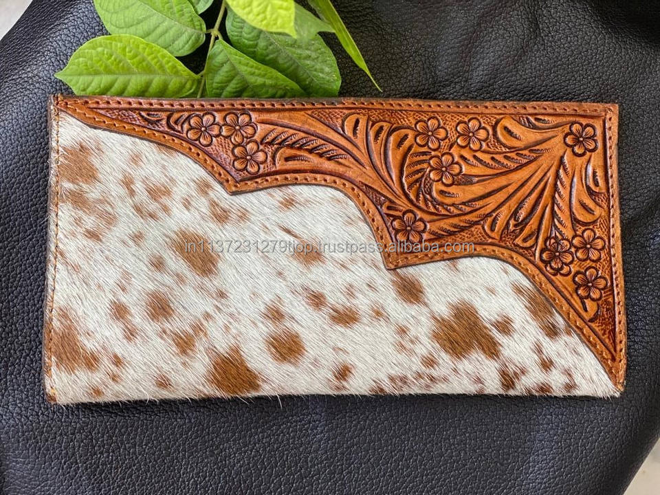 New Arrival Hand Tooled Carving Wallet Clutch Phone Case Stylish Cowhide Fur Leather Wallet Multi Uses Western Leather Wallet