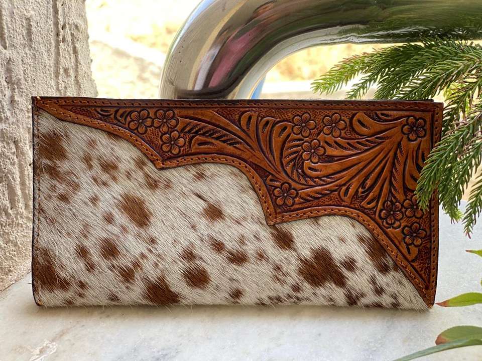 Cowhide Fur Hand Tooled Carving Wallet Clutch