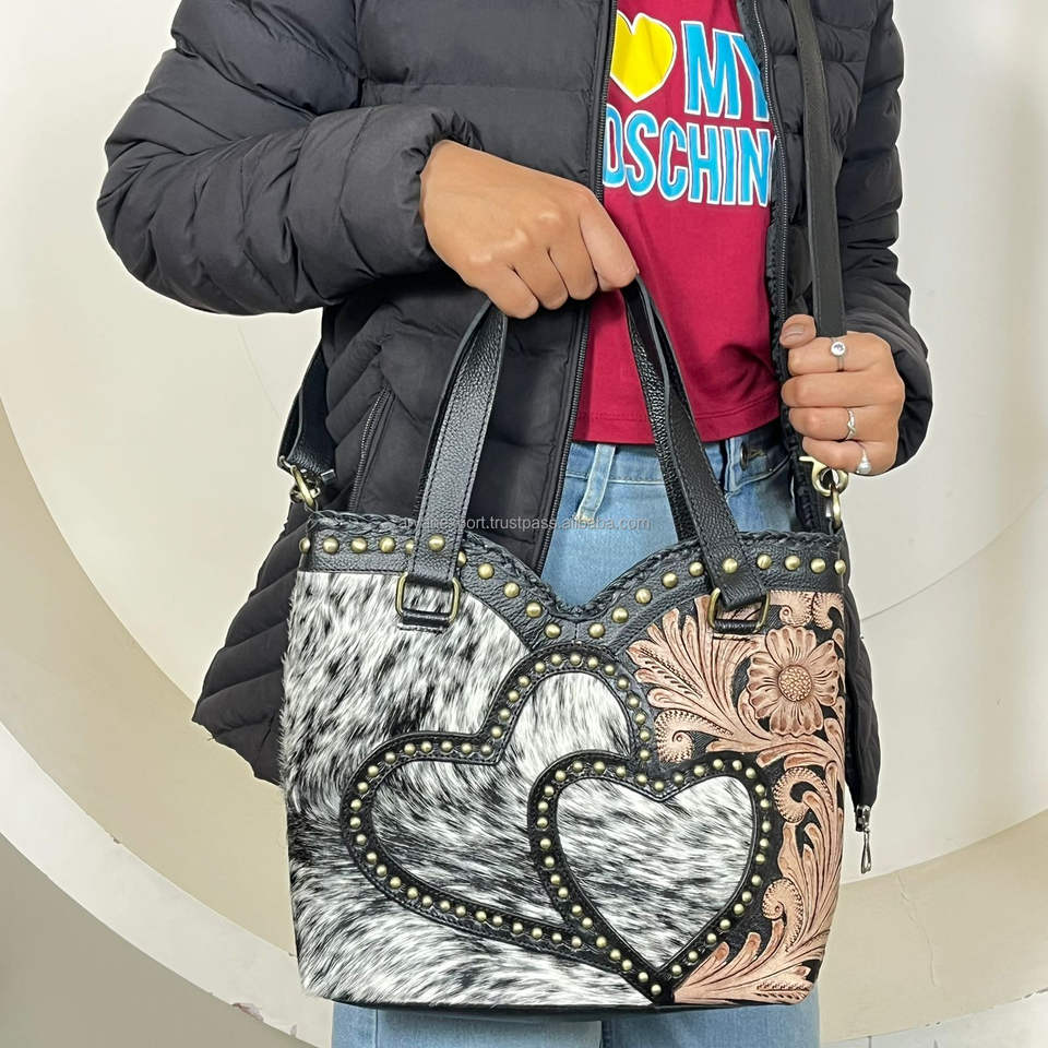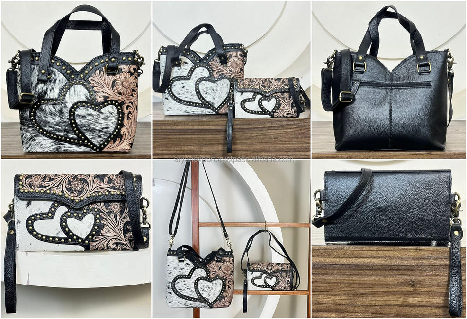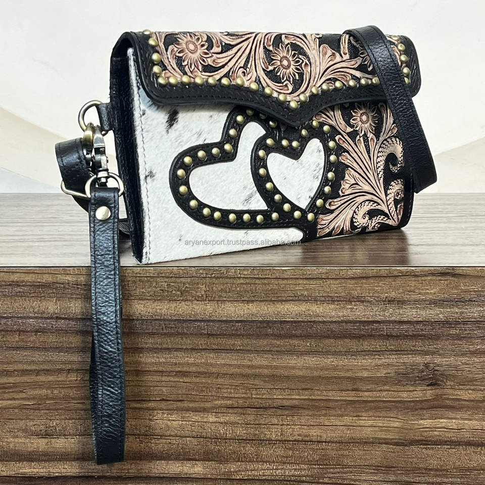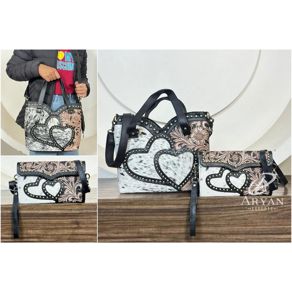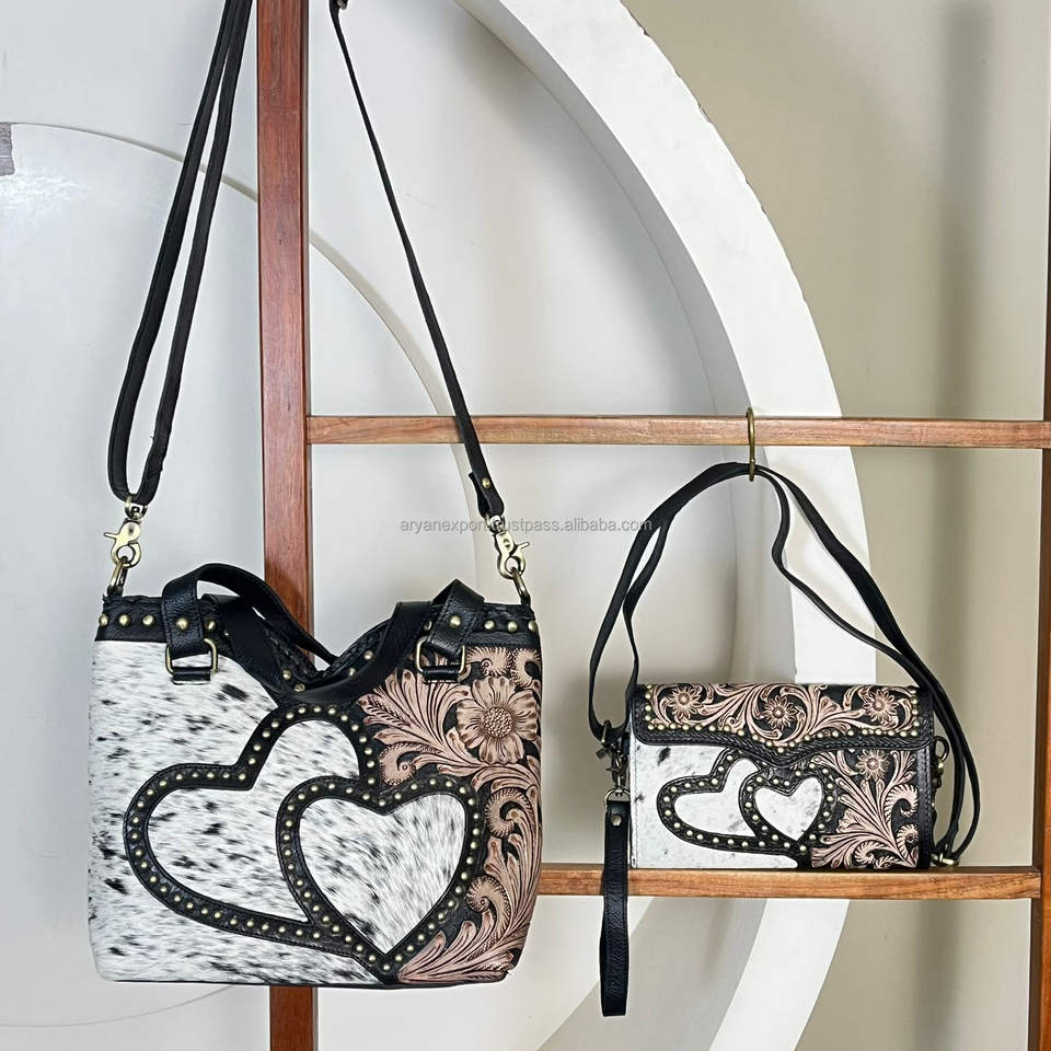 Nouveauté : Ensemble de sacs messager en cuir de vachette fait main avec motif cœur, sac à bandoulière floral de style western avec portefeuille assorti pour femme