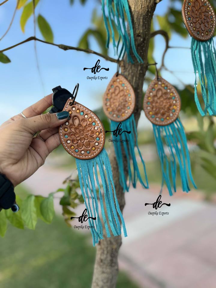 Hand Tooled Leather Keychain Turquoise Color Keyrings Keychains