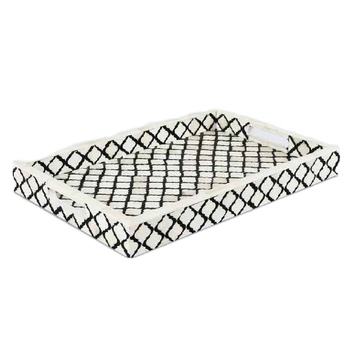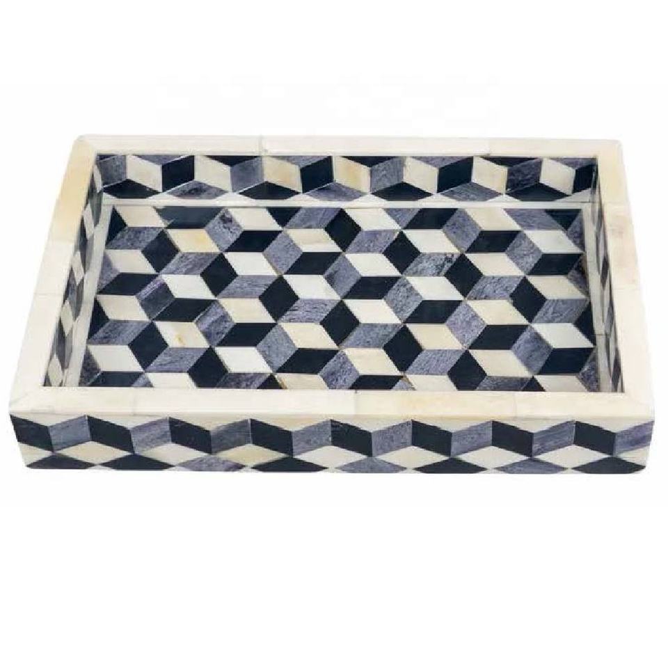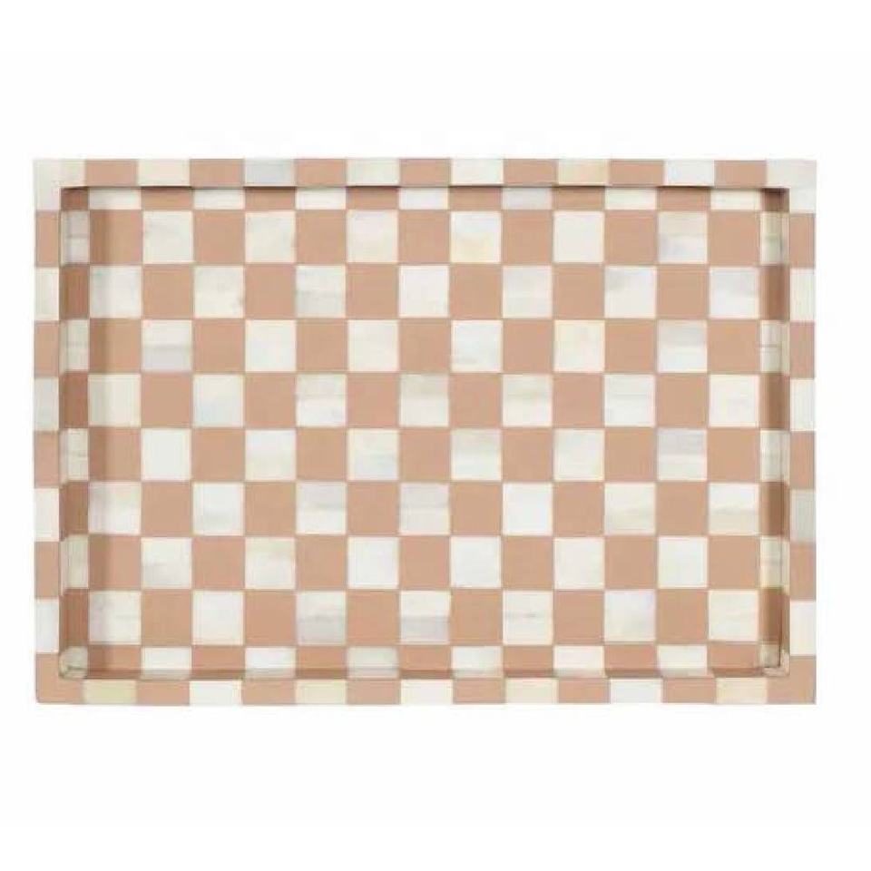 Nouvel arrivage : Plateau de service polyvalent pour petit-déjeuner, fait main, motif damier, incrustation d'os, amande et crème, origine Inde