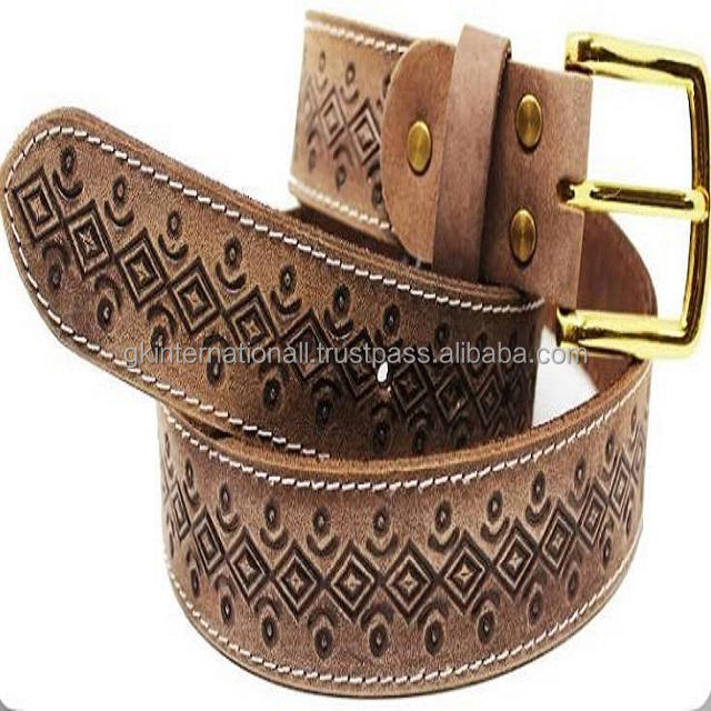 Nouvel arrivage de ceinture d'outillage en cuir de style occidental artisanal pour ceinture unisexe en cuir usiné sculptée à la main avec boucle dorée