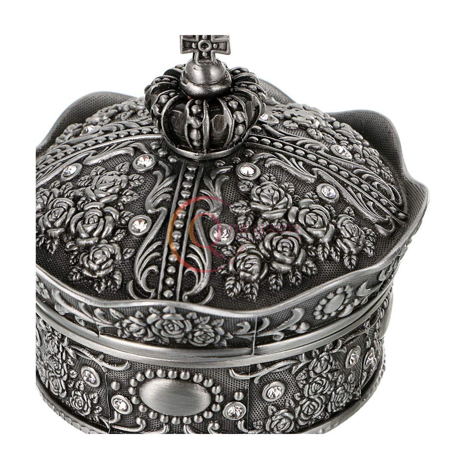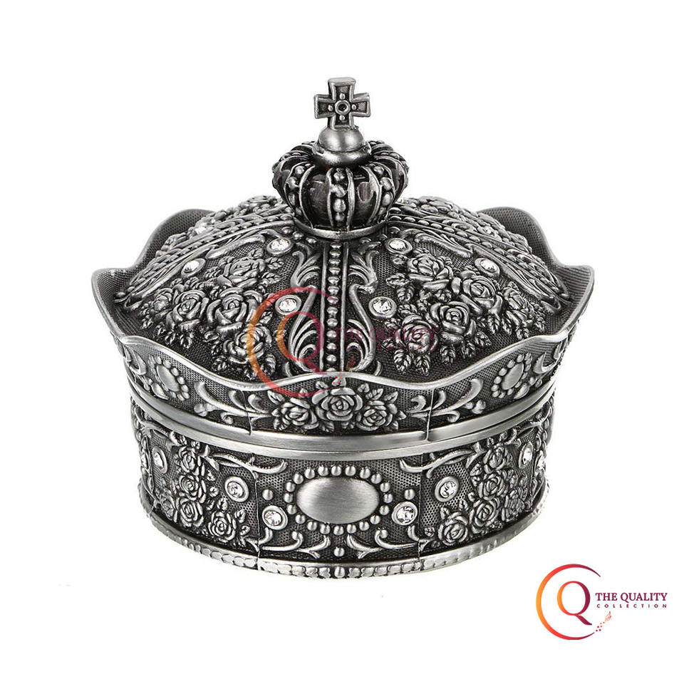 Nouveauté, boîte à bijoux en laiton plaqué argent fait à la main, forme ronde, couronne, métal avec design en relief, boîte de présentation de bijoux