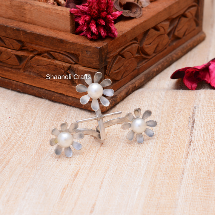 Oxidised Silver Two Finger Ring With Pearls Statement Boho Jewelry