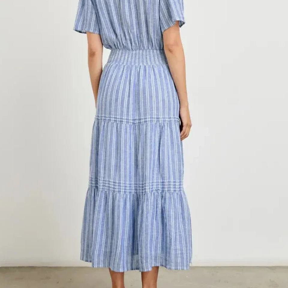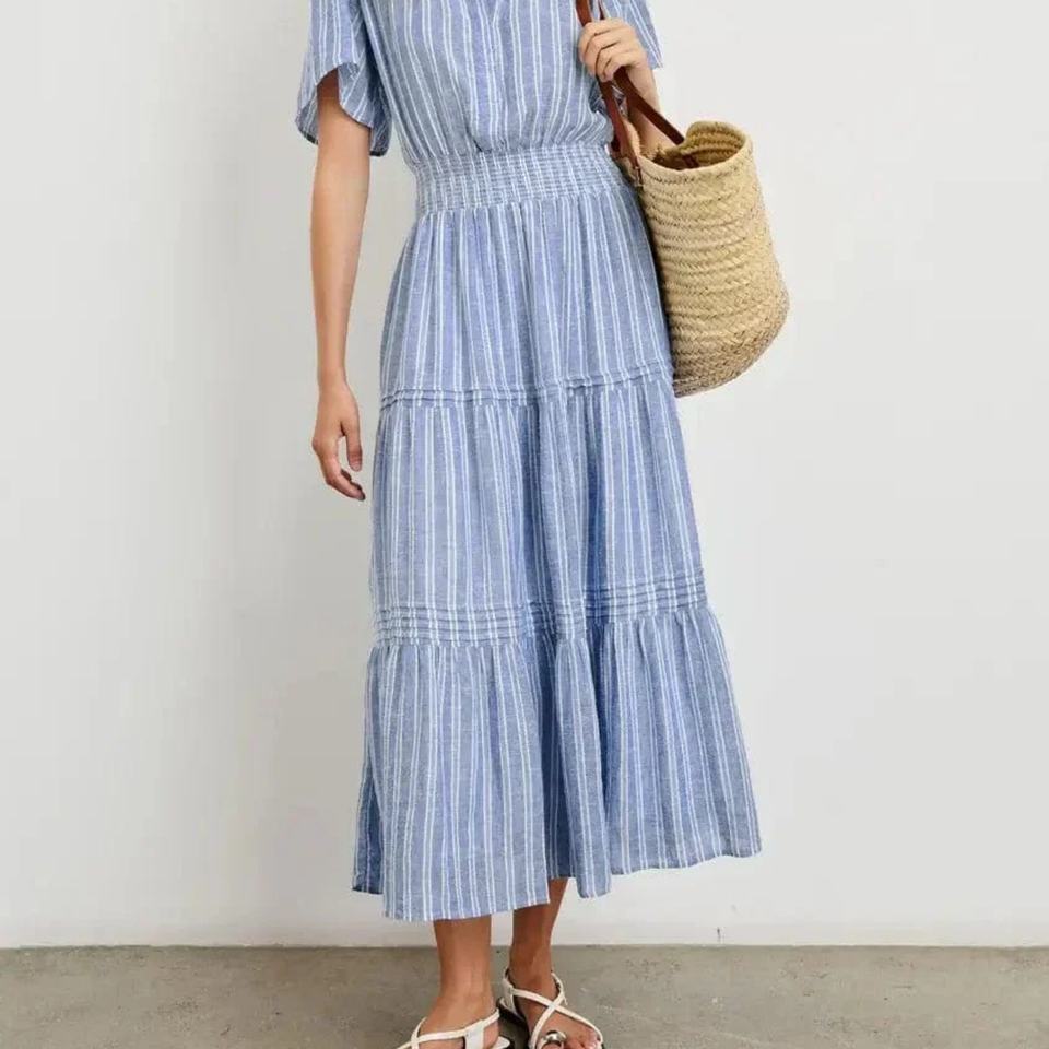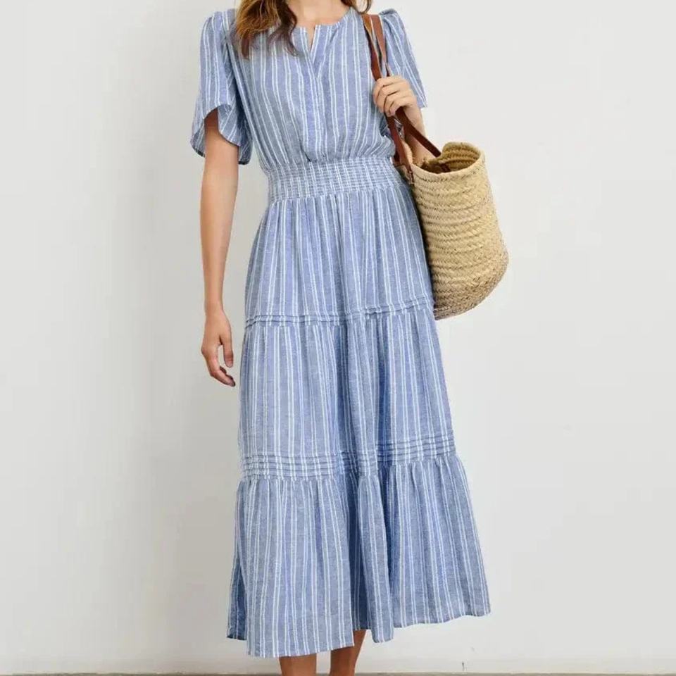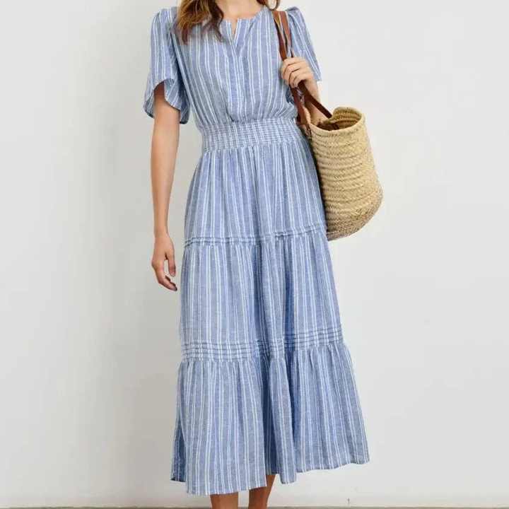 Nouvelle Arrivée Robe Midi Femme en Lin Mélangé de Haute Qualité, Manches Courtes, Décontractée, Froncée, Coupe Ajustée, Formelle