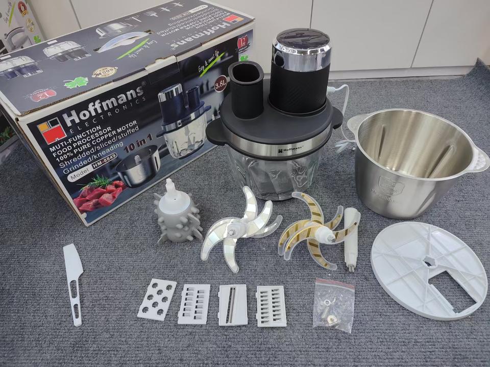 Nouveauté Robot de cuisine électrique Hoffmans 10 en 1, robot culinaire 3,8 L, double bol en verre, acier inoxydable, 1800 W, hachoir, éplucheur