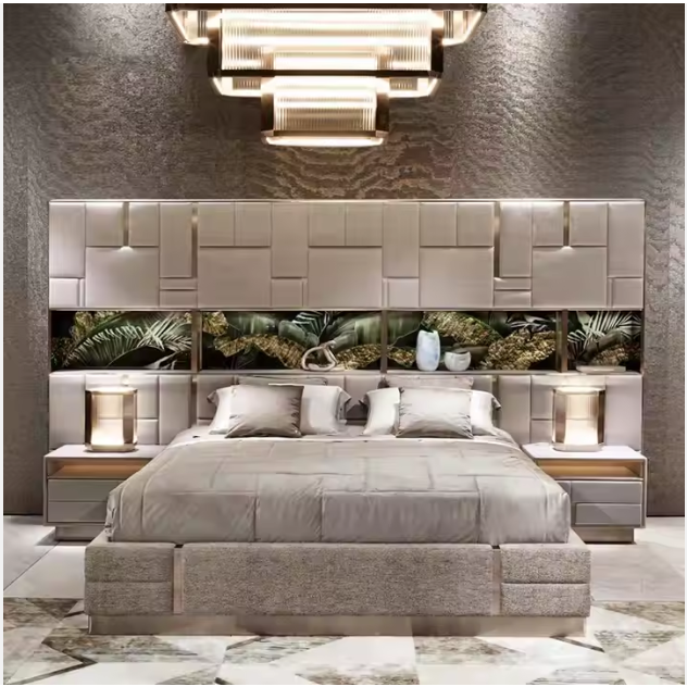 New Arrival Italian Latest Luxury Bedroom Furniture High End Leather Double Bed Big Headboard Luxury Modern King Size Bed