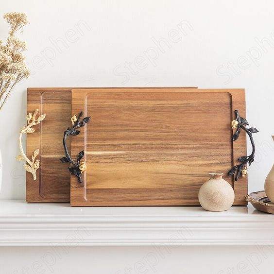 Nouvelle arrivée dernière conception plateau en bois de forme ovale avec poignée en métal plateau en bois de grande qualité de fournisseurs en gros
