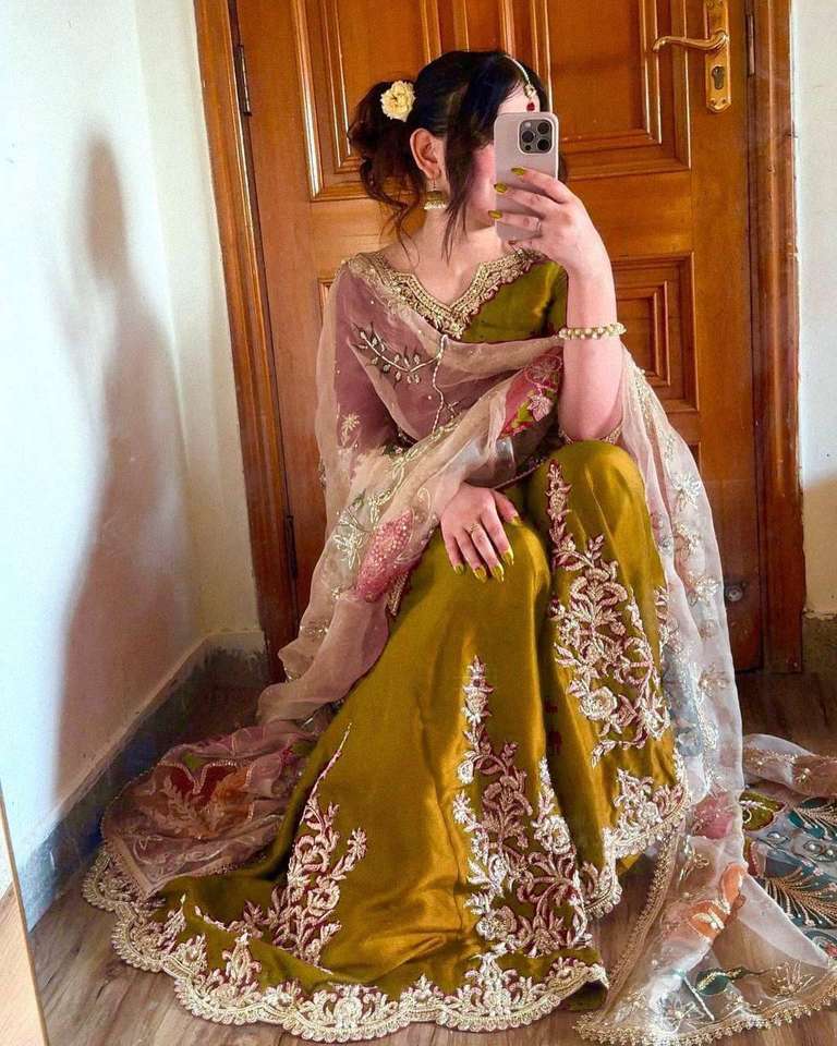 Nouveauté dernier haut brodé de créateur avec séquence en chinon et impression numérique en gharara et organza avec bordure en dentelle Dupatta