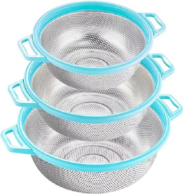 New Arrival Metal Colander Sky Blue Set of 3 Kitchen Food Strainer for Vegetable Fruits Seeds Fruits Rice Small Grains Spaghetti