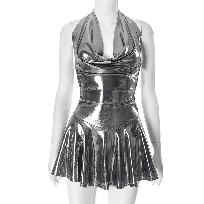Nouvelle arrivée, robe mini sexy à bretelles halter, couleur métallique tendance, col en V, jupe plissée moulante, mode féminine