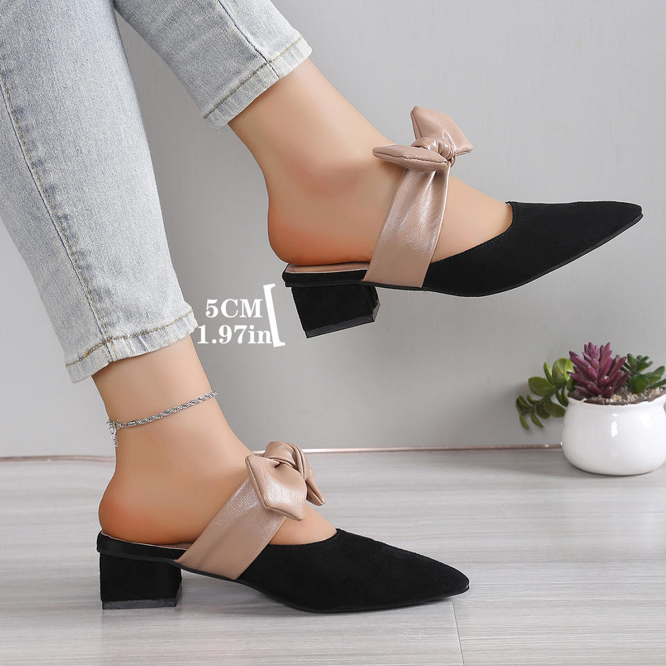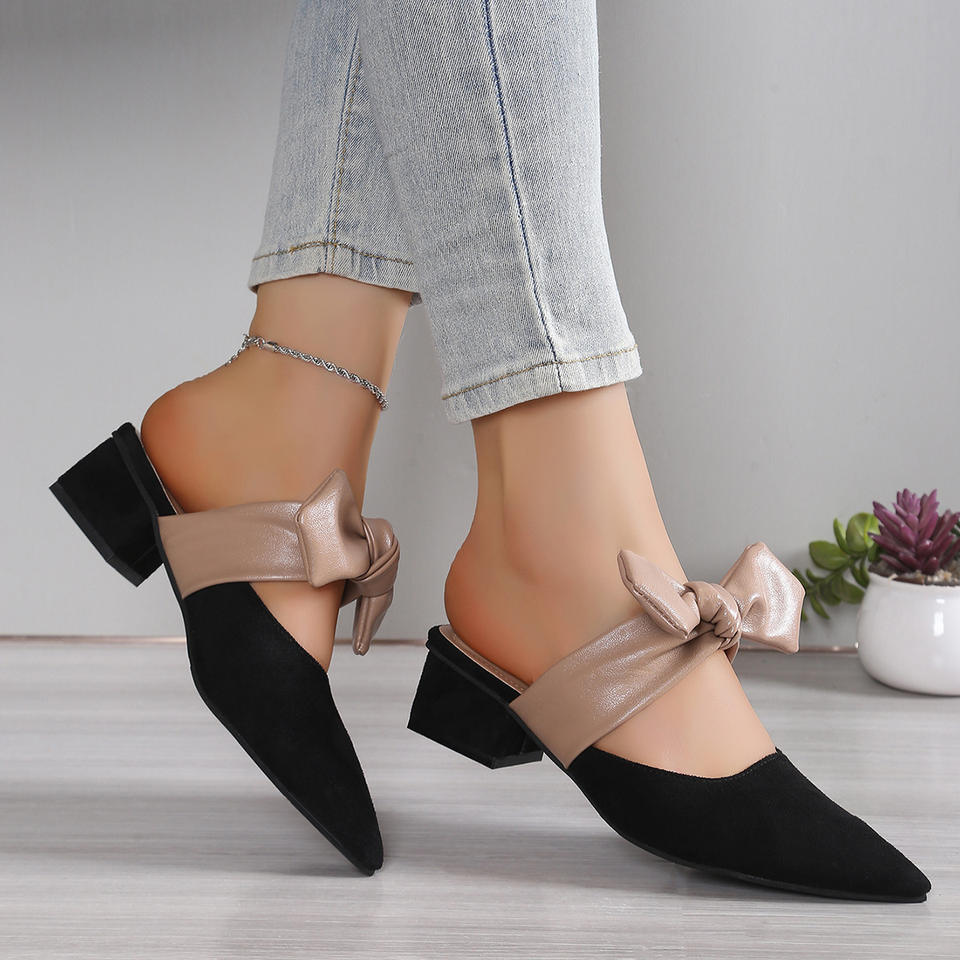 Nouvelle Arrivée Sandales à Talon Moyen à Bout Pointu et Nœuds, Color Block, Élégantes, à Talon Épais, Grande Taille, Été 2205
