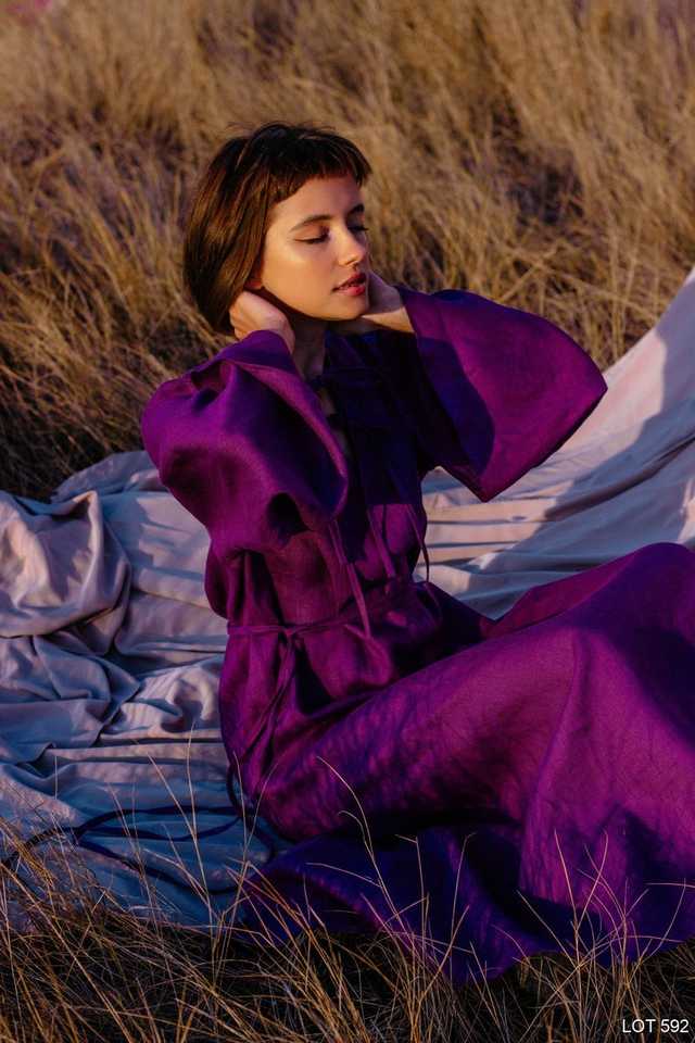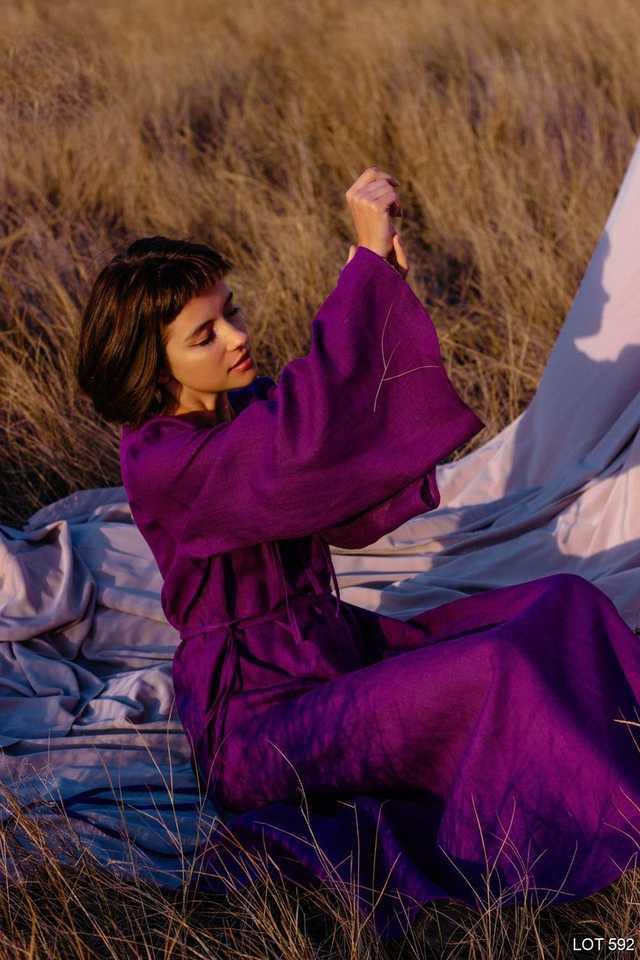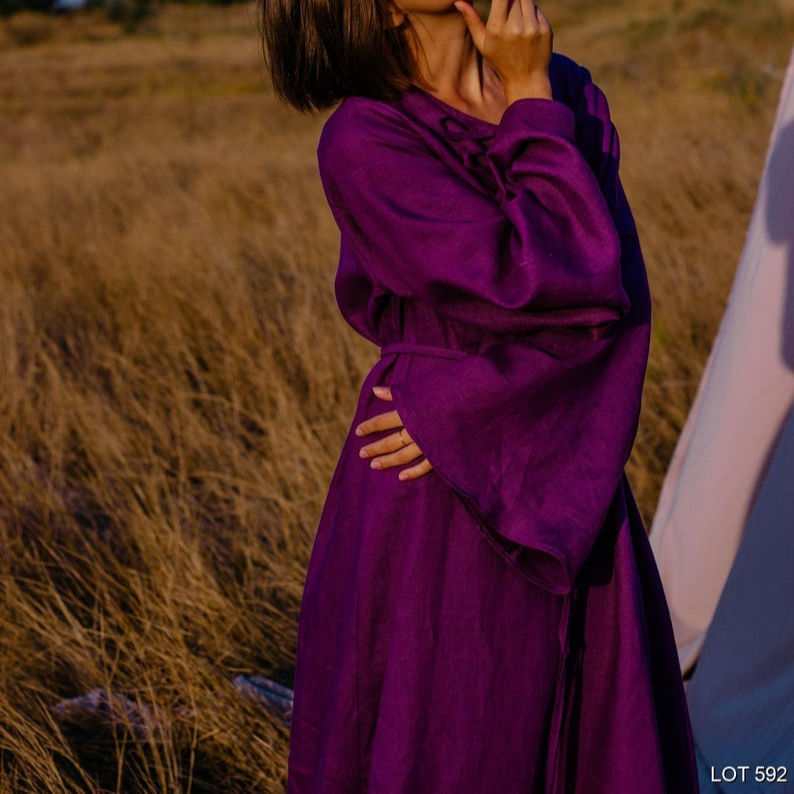 Jolie robe en crêpe à manches longues, col en v sans poches, de style Boho, Kaftan, tunique en lin de grande taille, de couleur violette, nouveauté